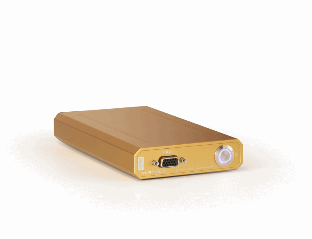 The Vertex.C is an all-round potentiostat/galvanostat/ZRA with FRA/EIS (not available as a DC-only instrument). Its low cost and wide specifications result in a versatile single-channel instrument, and multiple instruments are an attractive alternative to a multi-channel solution. The cell is connected with our standard shielded cell cable via the HD15 cell connector. The Vertex.C is capable of all standard electrochemical techniques and includes a complete suite of IviumSoft control and data processing software (for Windows based PCs).